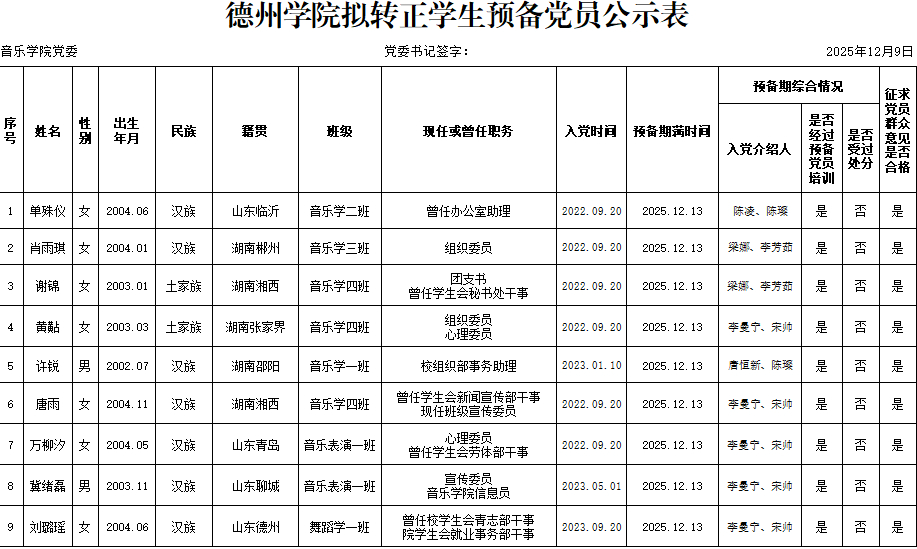 经党组织培养考察,征求党员、群众和入党介绍人意见,拟于近期讨论单殊仪等9名同志转为中共正式党员。为增强发展党员工作的透明度,接受党内外群众的监督,确保发展党员的质量,根据上级文件精神和《中共伟德国际1946委员会发展党员工作实施细则》的要求,现将拟讨论转正的中共预备党员基本情况公示如下(名单附后):