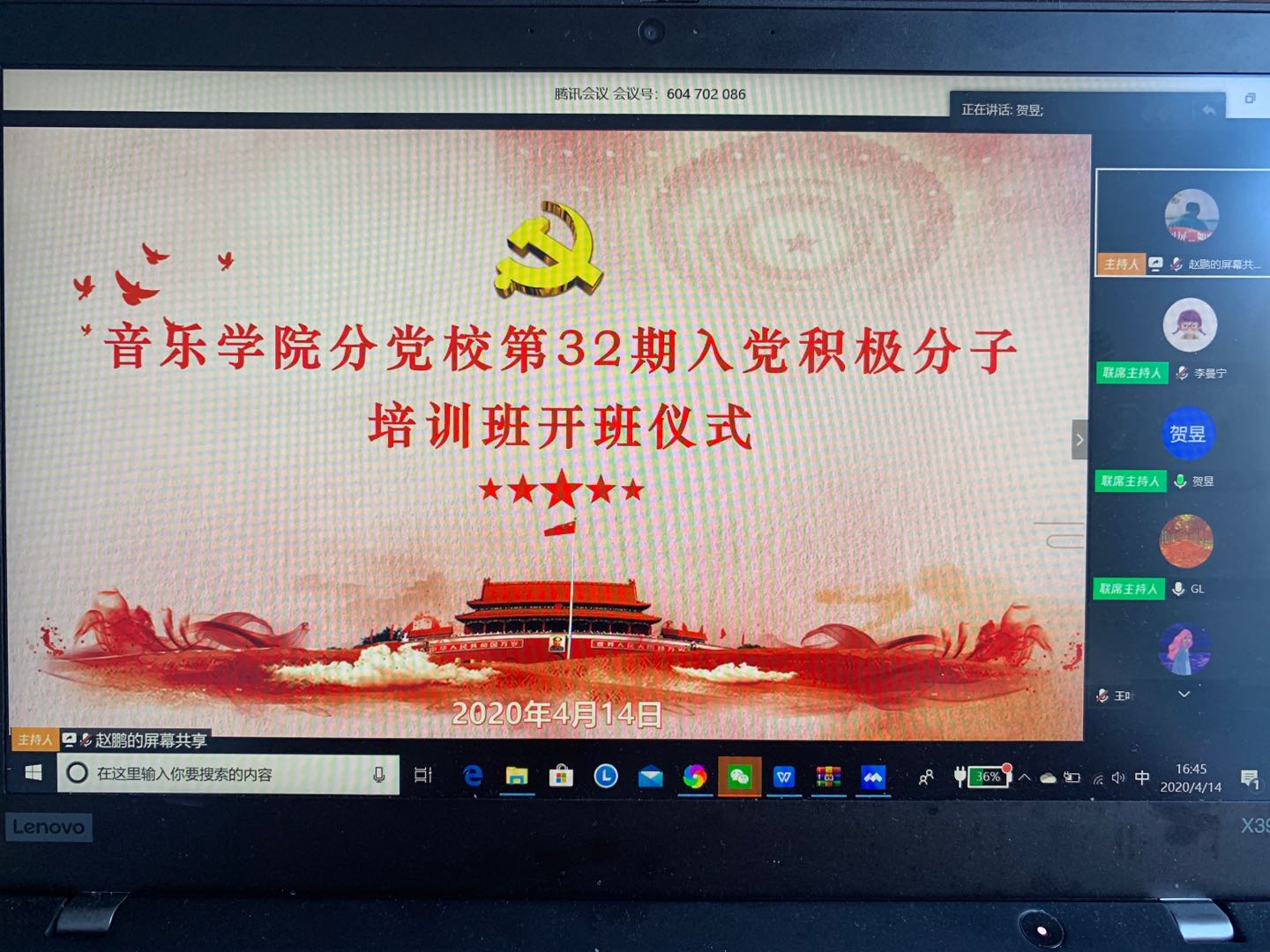 为加强入党积极分子政治素养,结合当前疫情防控形势,伟德国际victor1946采用“云党课”线上授课模式,将线上党课指导与线下自主学习相结合,创新教学方法,扎实做好疫情防控期间党员发展工作。4月14日下午,伟德国际victor1946第32期入党积极分子培训班开班仪式暨第一堂党课通过腾讯会议线上举行。党总支书记高莉,党总支副书记贺昱,辅导员李曼宁出席了开班仪式。仪式由党总支副书记贺昱主持,培训班全体54名学员参加。