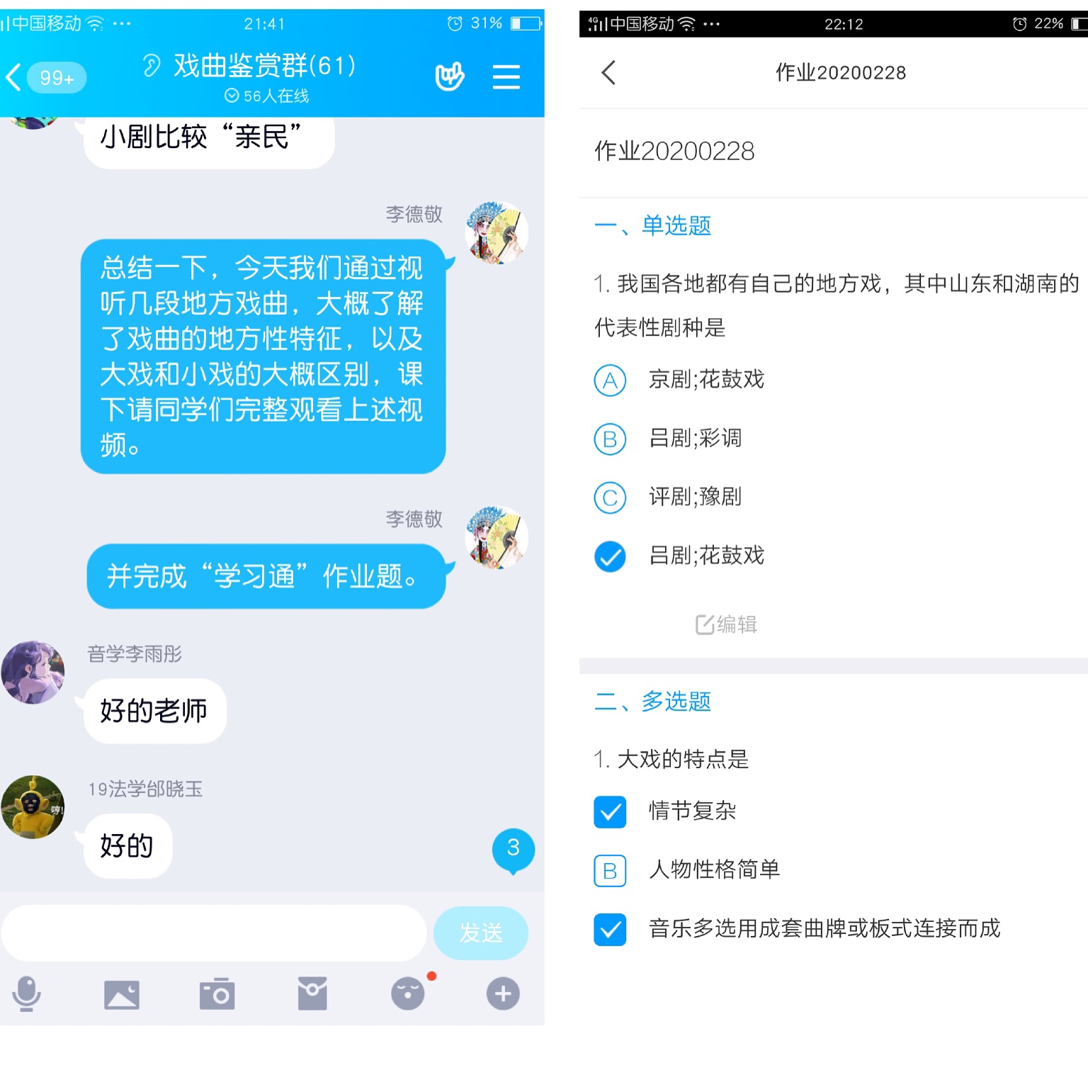 线上授课最大的问题在于对于学生的上课状态无法把控,这就对教师的授课技巧提出了更高的要求。本学期新开设的戏曲鉴赏课是面向全校的公共选修课,戏曲是我国优秀的传统文化,如何让不同专业的当代大学生对戏曲感兴趣,认识到它的价值与艺术魅力,第一次课的好坏尤为关键。李老师精心作了这样的设计:首先提前一天与学生交流,询问了学生的家乡所在地,得知学生来自全国十一个省份,根据这一情况,挑选了这些省份的代表性剧种的代表剧目共十个唱段的音频,课前发给学生。上课时,首先要求学生用自己的家乡话做自我介绍,在QQ平台上发送语音,来自山东、河南、浙江、山西等地的同学发送了具有鲜明地域风格的方言,大家听了都觉得很新鲜,气氛也很活跃,这时告诉同学们这样做的目的是想提醒同学们方言不仅是一种讲话的方式,而且它是地域文化的承载者,它承载着不同地域人的情感表达方式、性格特征和审美情趣,从刚才的语音中,大家是不是感受得到江南人与西北人不同的细腻缜密与质朴豪放的性格特征呢?而且,方言与戏曲有着密切的关系,各种地方戏就是在方言的基础上孕育发展起来的,换句话说,没有了方言,戏曲将失去生存的土壤,所以,同学们要讲好方言,你这是在传承传统文化,保护戏曲。这就点出了学生要热爱自己的方言热爱家乡这一高度。这也获得学生的一致认同。然后,让学生说出自己家乡的地方戏名称,学生了解程度不一,接着让他们依次聆听十个唱段的音频,并记录剧种名称。公布完答案,让学生“认领”自己的家乡戏,学生这时都非常有感触,感受到了戏曲非常“好听”。接下来向群里发送以上音频的视频,让学生来观看戏曲艺术的舞台魅力,这时学生的情绪都被“点燃”了。观看完这些视频,与学生互动讨论不同剧种在表现题裁、表演风格、音乐体制等方面的差异,进一步使学生加深了对于戏曲剧种的认识,也激发对戏曲的浓厚兴趣。总之,通过利用平台的各种功能,巧妙设计内容,可以达到与现场教学相同的效果。
