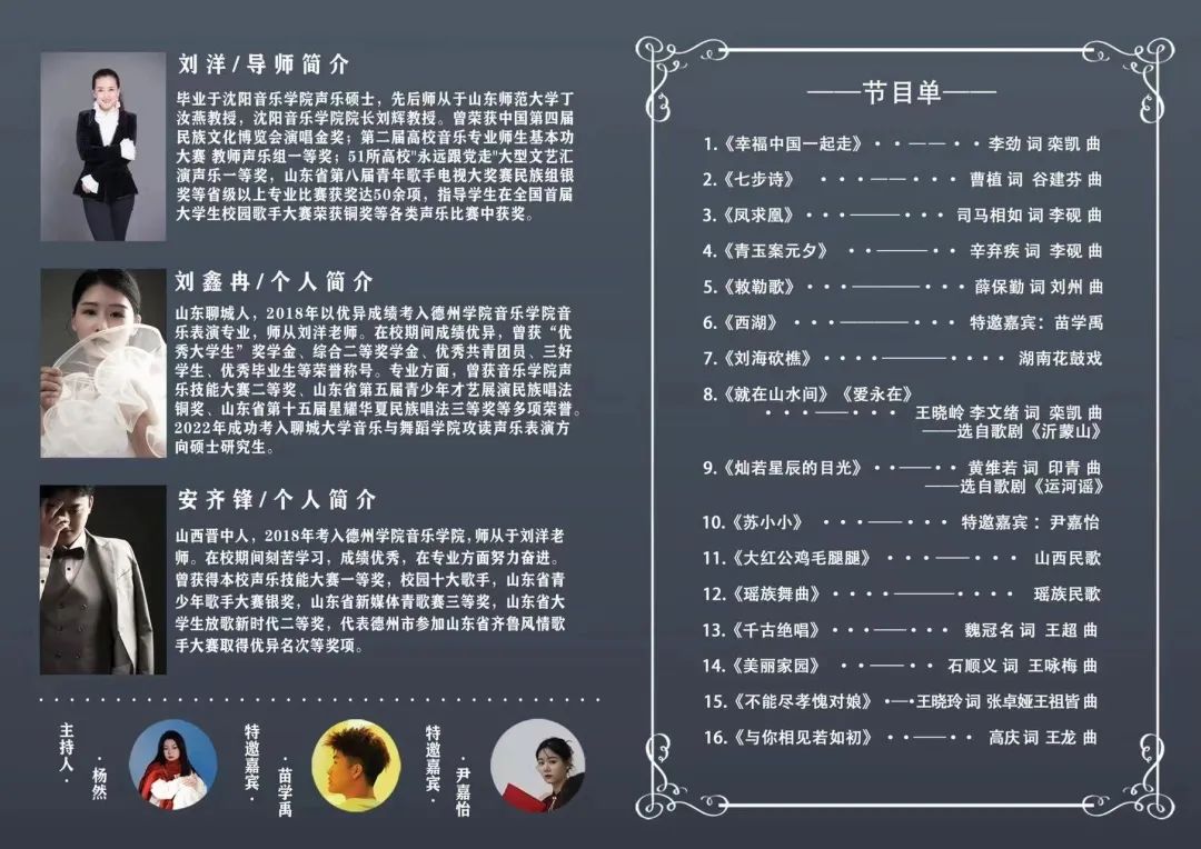 此次音乐会是刘鑫冉、安齐锋四年来声乐学习的梳理与汇报,通过不同类型的歌曲,运用多样的技巧,展示了不同的演唱风格,是音乐表演专业课堂教学与舞台表演相结合、学生创新能力与表演实践相结合的成果体现,为毕业生走向社会打下了坚实基础。
