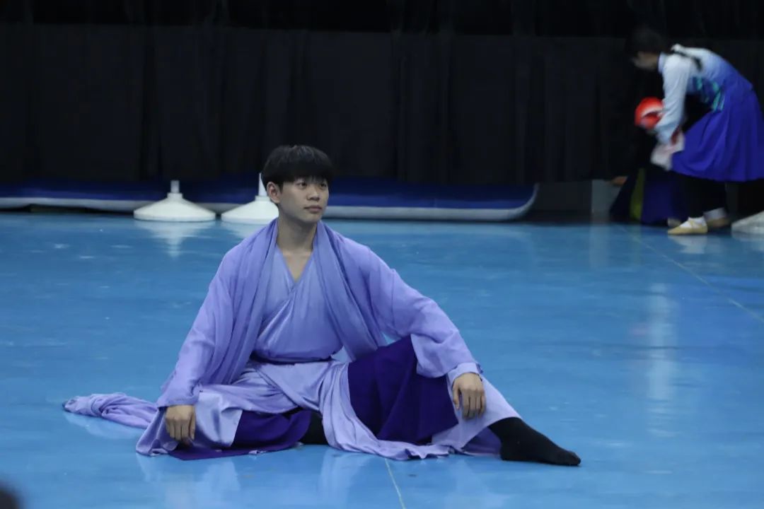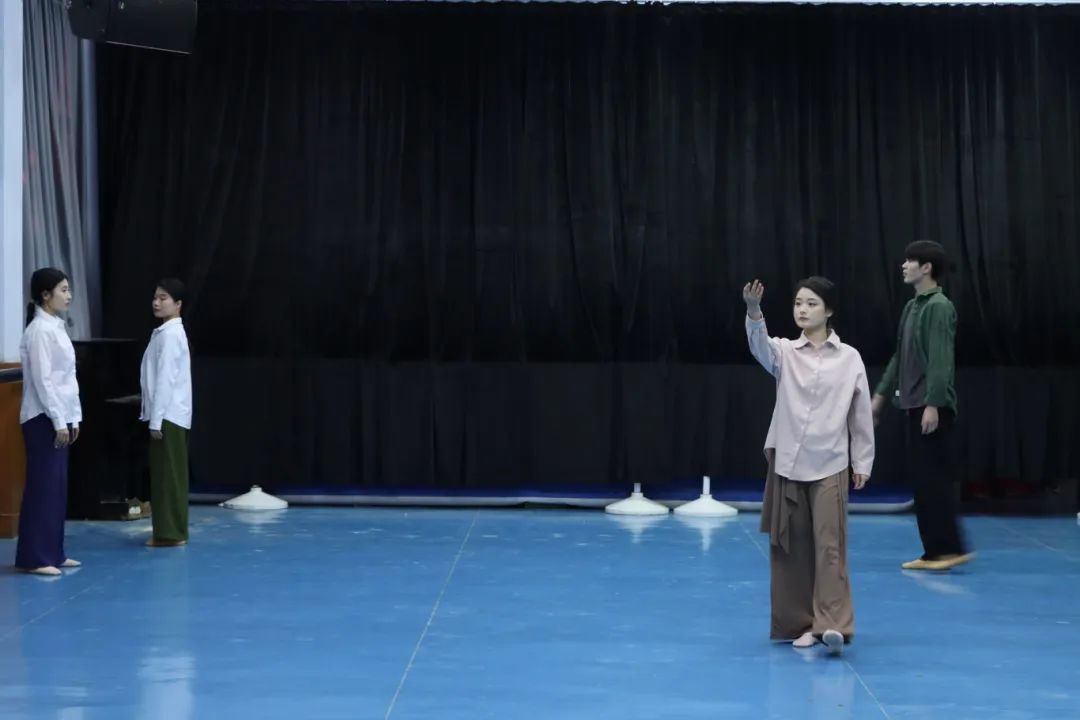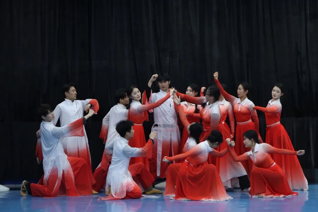 在一楼舞蹈房内,学生们身着绚丽的服饰,以轻盈的身姿在舞台上穿梭,瞬间吸引了观众的目光。群舞《大河印象》以其恢弘大气和细腻入微的表现力,勾勒出大河的万千气象。独舞《问月》则凭借舞者精湛的技艺和细腻的情感,构建出一个诗意的舞台空间,令人沉浸其中。群舞《逐流》以流畅如水的肢体线条,勾勒出潺潺溪流的景象,舞者们的身体起伏和手臂摆动如同水流蜿蜒,展现了团队的默契与凝聚力。双人舞《守月人》如同一幅淡雅的水墨画,幽蓝光晕营造出孤寒的夜色,舞者静立的姿态仿佛与明月、天地融为一体,隐喻着坚守内心微光的灵魂。群舞《白马》以刚健有力的动作和整齐划一的手臂挥扬,展现出万马奔腾的气势;而群舞《我心中的红》则用肢体语言诉说对红色精神的炽热追寻,化作舞台上熠熠生辉的精神火种。
