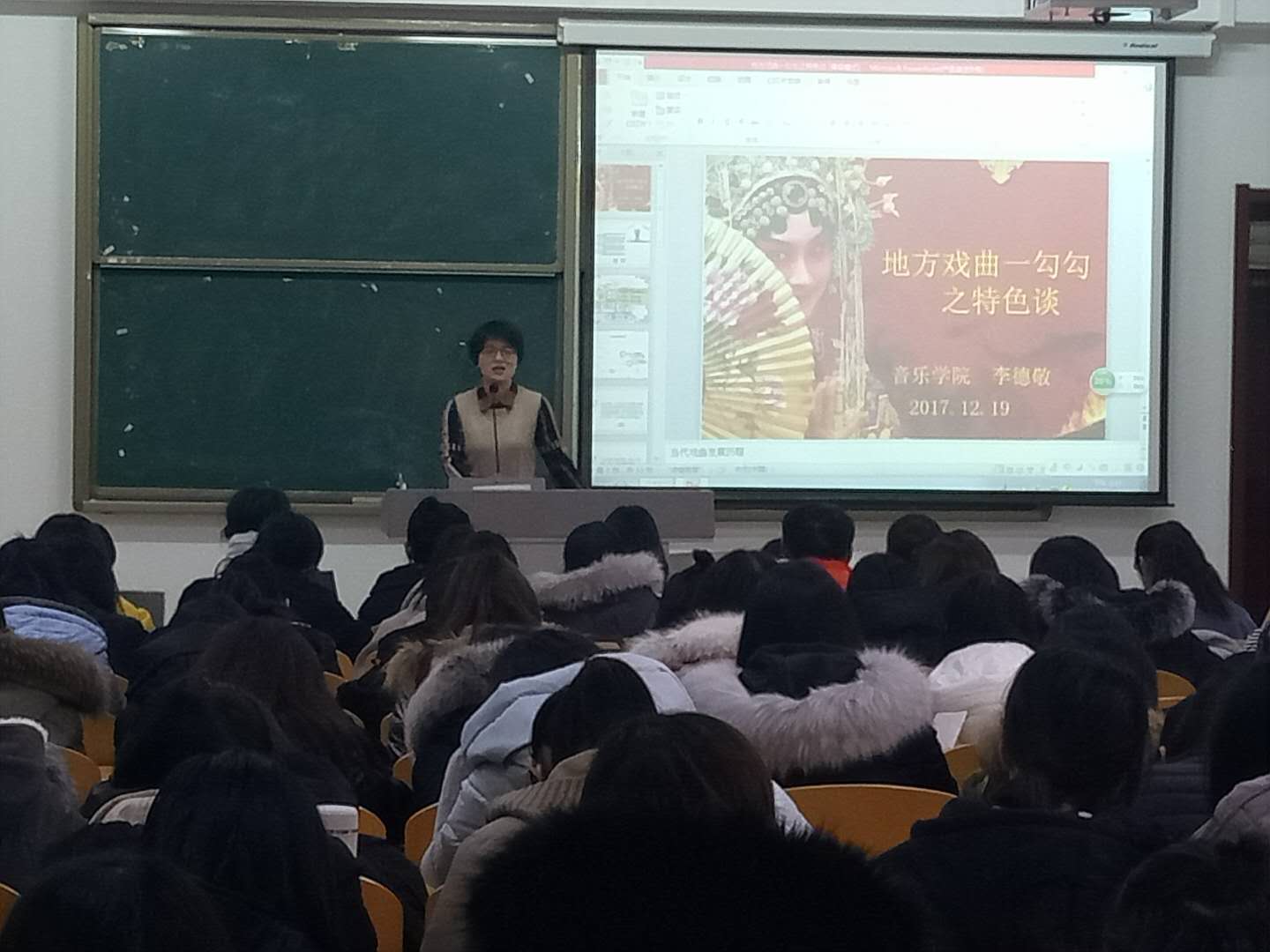 12月19日下午,伟德国际victor1946李德敬副教授在博文楼为全校师生作了题为《地方戏曲一勾勾艺术特色谈》的讲座。