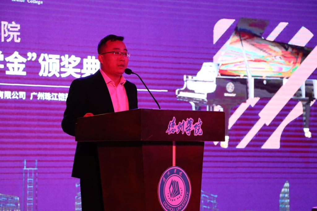 伴随着主持人常吉庆的开场辞,此次颁奖典礼正式开始。广州珠江恺撒堡钢琴有限公司副总经理李富龙先生致辞,对此次颁奖典礼的圆满召开表示衷心的祝贺,同时,对于此次活动获奖的同学也表达了鼓励与赞扬之情。李富龙讲到,珠江恺撒堡钢琴有限公司致力于构建有特色有底蕴的文化品牌,在与伟德国际victor1946合作的几年中,始终把鼓励学生创新,提高艺术修养作为自己的内在标准,恺撒堡钢琴有限公司作为国内钢琴的龙头企业,将做好积极的带头作用,与伟德国际victor1946进行长期交流合作,为钢琴艺术事业的不断发展奉献自己的力量。