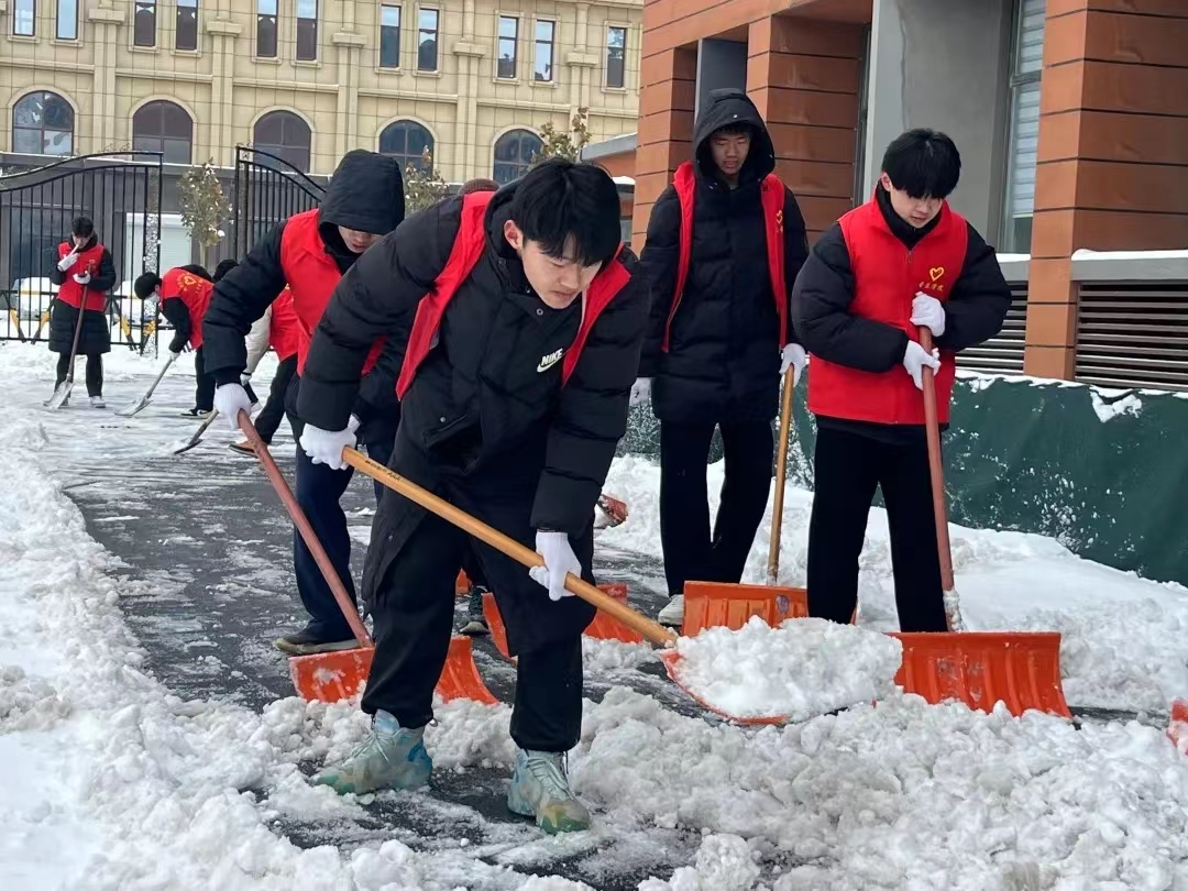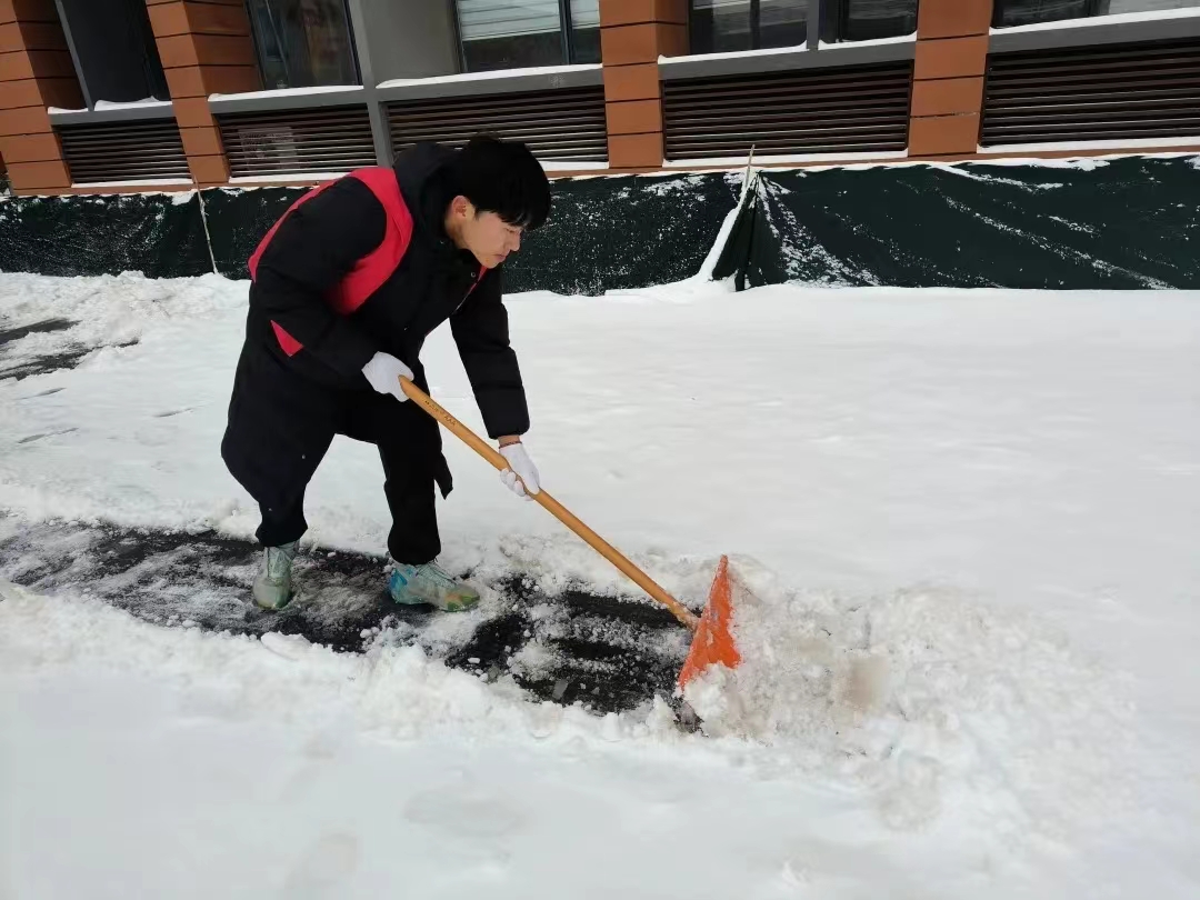 在此次志愿活动中,志愿者们不畏严寒,在寒冷的天气里,拿着铁锹积极的投入扫雪活动中。从校内操场到校外街道,志愿者们齐心协力,配合默契,扫雪、铲冰、清运一气呵成,大家互相替换、互相配合、互相鼓劲,让“志愿红”成为皑皑白雪中一道靓丽的风景线。