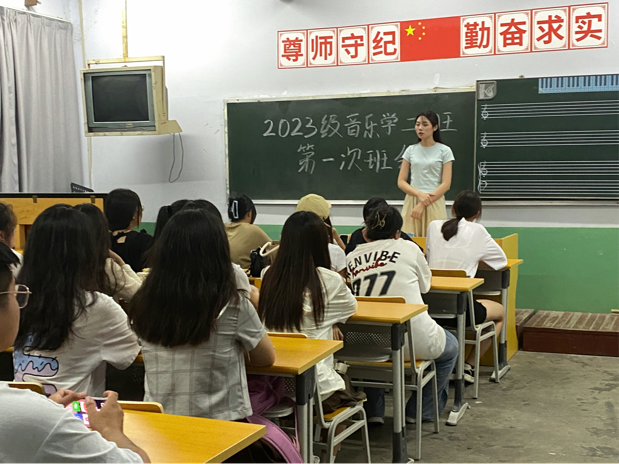 为增进师生间的相互了解,加强班级凝聚力,使同学们快速的融入班集体,尽快适应大学生活,9月3日,2023级各班在音乐楼召开了第一次新生班会,班会由各班班主任主持。