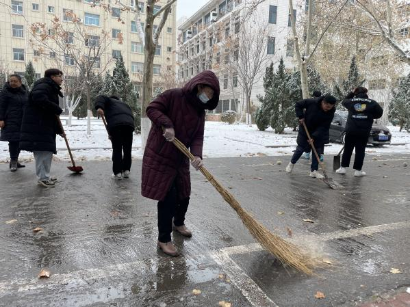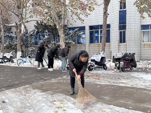 寒冷的天气丝毫不影响大家的热情,大家不畏严寒,齐心协力,配合默契,拿起铁锹、镐头、扫帚等工具,有序地清理道路积雪、铲除路面结冰,忙碌的身影在冰天雪地里构成了一道亮丽的风景线。
