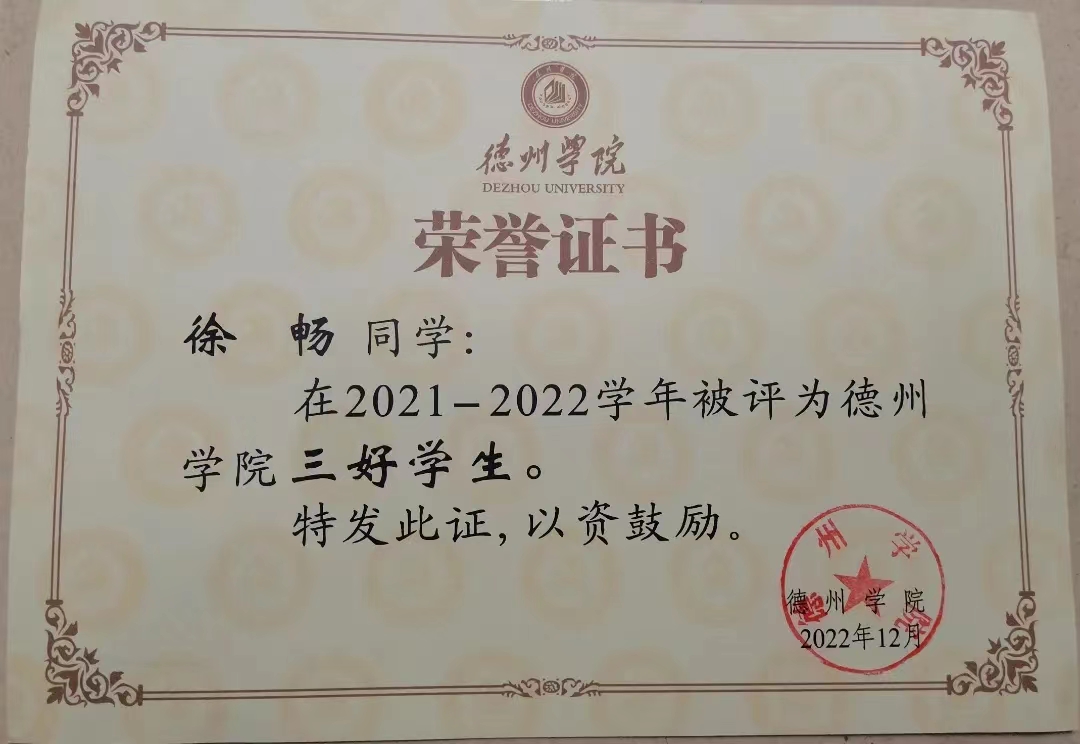 有思想、有信念才能善为,方能远行。步入大学后,她积极参与党团活动,带领班级同学参与主题团日活动、完成青年大学习团课学习。积极向党组织靠拢,现已成为一名中共预备党员,她坚定理想信念,牢记党的宗旨,努力提高自己的思想觉悟,以理想信念筑牢发展根基。2022年她积极响应学校号召,参与德州市“线上战疫云辅导”志愿服务活动,帮助学校为居家隔离的中小学生开展培养兴趣爱好的志愿服务。