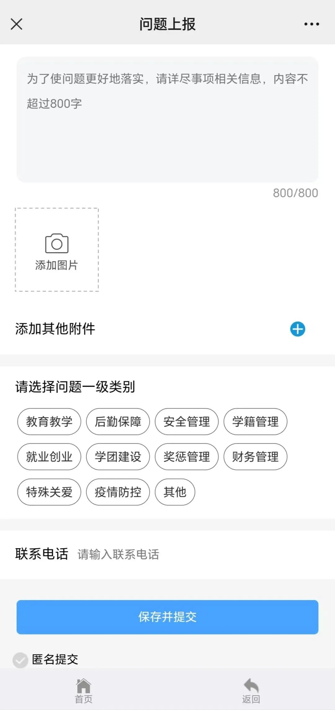 注意:选中匿名提交的问题学校处理时看不到问题上报人的姓名(注册时填写的真实姓名)。