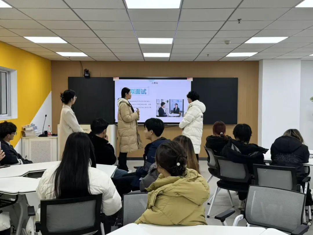 在互动环节,“逛三园”游戏率先登场,以“毕业生们在想什么”为主题,同学们依序围绕“要毕业”“我百感交集”分享感受。随后的模拟面试环节,同学们两两分组,分别扮演面试官、求职者,模拟真实面试场景,问答结束后,其余同学给予反馈建议,助求职者精进表现,提前熟悉面试流程。
