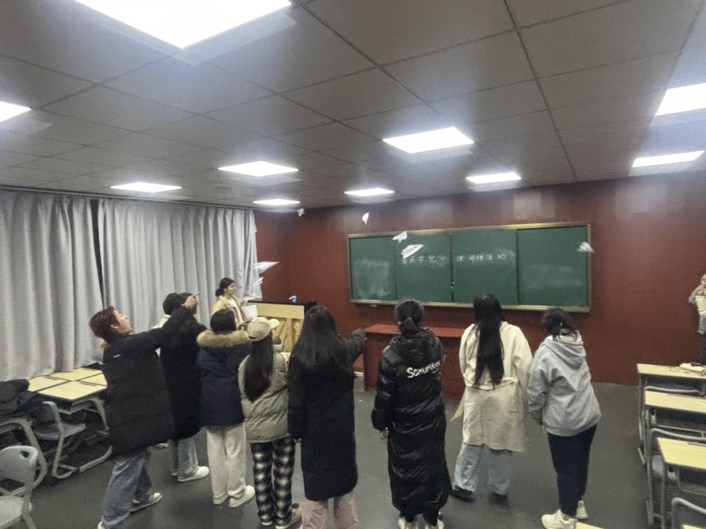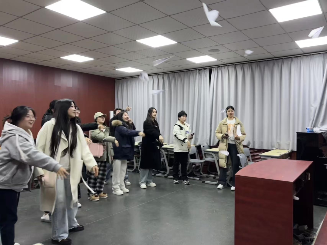 同学们把自己的压力和烦恼写在纸上,再将纸条折成纸飞机,飞往讲台,放飞压力。