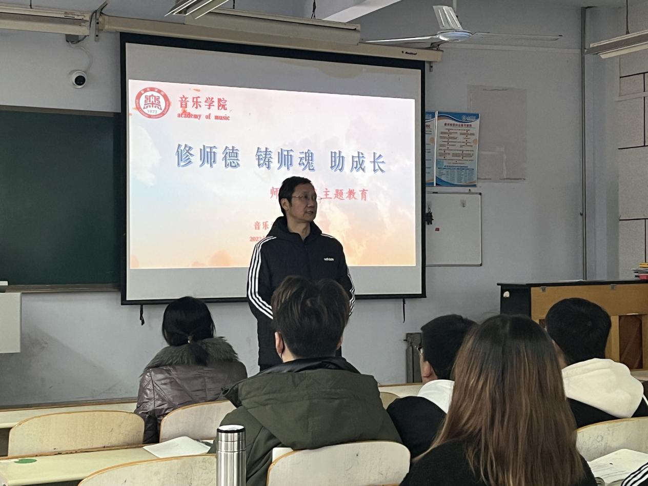 随后,伟德国际victor1946副院长段文介绍了作为一名新时期合格的音乐教师应具备的条件。他指出,伟德国际victor1946要培养和造就一批自信于‘舞台’、立足于‘讲台’的新型音乐教师。强调师范生应树立正确的职业态度和学习态度,以更加饱满的热情和更认真刻苦的精神对待专业知识的学习和职业素养的培养。段院长还分别从音乐专业知识与技能、音乐教育能力以及教育科研能力等方面给大家提供了相关的建议。