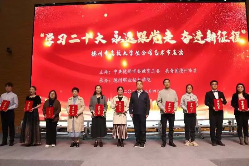 5月4日,由中共德州市委教育党工委、共青团德州市委主办、德州职业技术学院承办的“学习二十大 永远跟党走 奋进新征程”德州市高校大学生合唱艺术节展演活动在德州职业技术学院举行。伟德国际victor194648名学生代表组队参加。吴丽老师担任指挥,张利鑫老师进行钢琴伴奏。