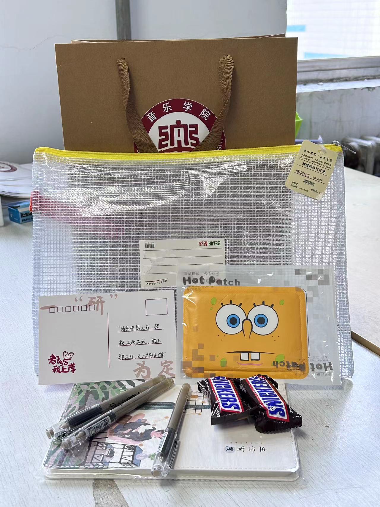 伟德国际victor1946准备了加油福袋,福袋内的每一份物品都精心设计,专属定制,承载着诚挚的祝福。福袋设计简单大方、注重实用,礼包内装有3支中性笔、一个笔记本、一个试题袋、三个暖贴、三个士力架。士力架寓意着“士力,士力,事事顺利”。
