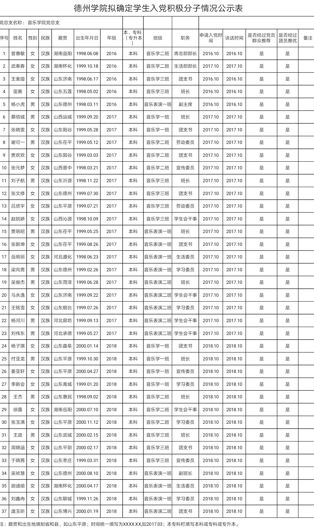 经党组织培养考察,通过党员、群众无记名投票推荐和团员推优,支委会讨论研究,拟确定魏丽、曾惠敏等38人为入党积极分子。为增强工作的透明度,接受党内外群众的监督,确保党员后备队伍的质量,根据上级文件精神和《中共伟德国际1946委员会发展党员工作实施细则》的要求,现将拟确定入党积极分子的基本情况公示如下(详见附表):