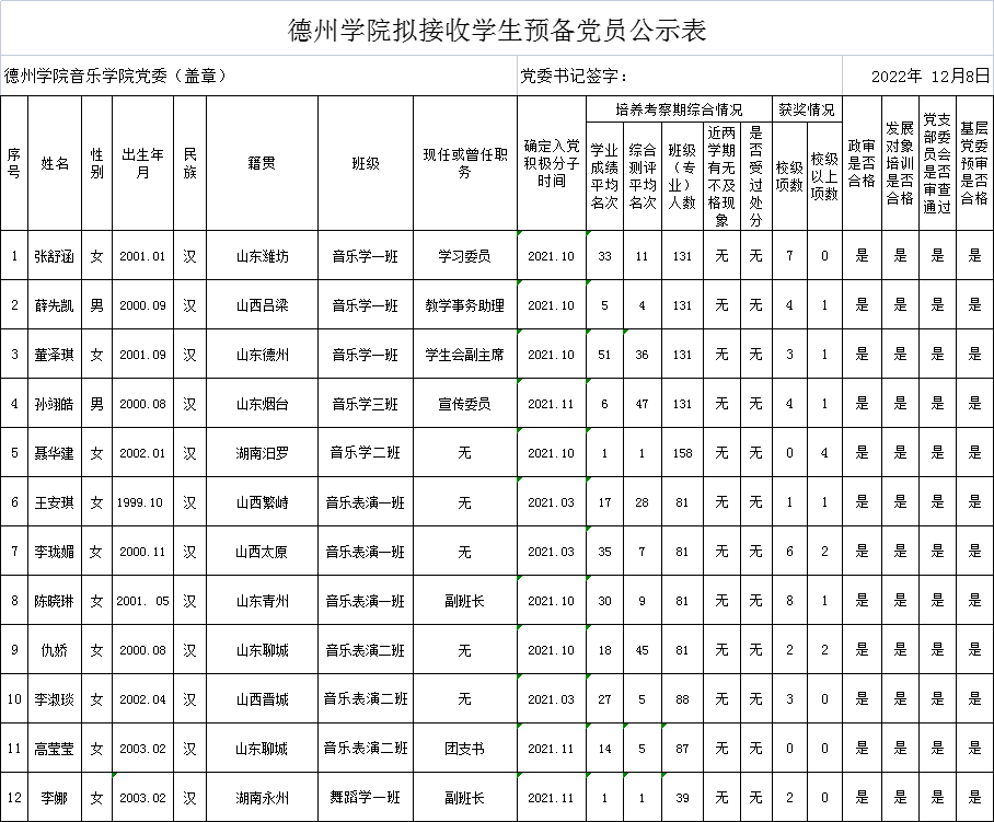 经党组织培养考察,征求党员、群众和培养联系人意见,支委会讨论研究、政治审查、集中培训、基层党委预审,拟接收韩晗等14名同志为中共预备党员。为增强发展党员工作的透明度,接受党内外群众的监督,确保发展党员的质量,根据上级文件精神和《中共伟德国际1946委员会发展党员工作实施细则》的要求,现将拟接收预备党员的基本情况公示如下(名单附后):