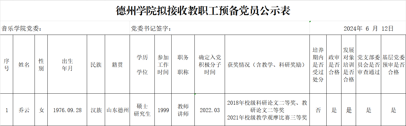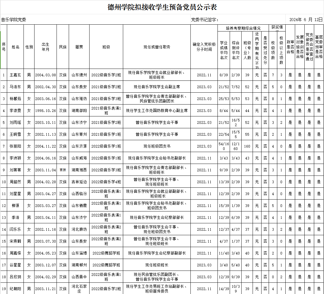 经党组织培养考察,征求党员、群众和培养联系人意见,支委会讨论研究、政治审查、集中培训、基层党委预审,拟接收乔云等20名同志为中共预备党员。为增强发展党员工作的透明度,接受党内外群众的监督,确保发展党员的质量,根据上级文件精神和《中共伟德国际1946委员会发展党员工作实施细则》的要求,现将拟接收预备党员的基本情况公示如下(名单附后):
