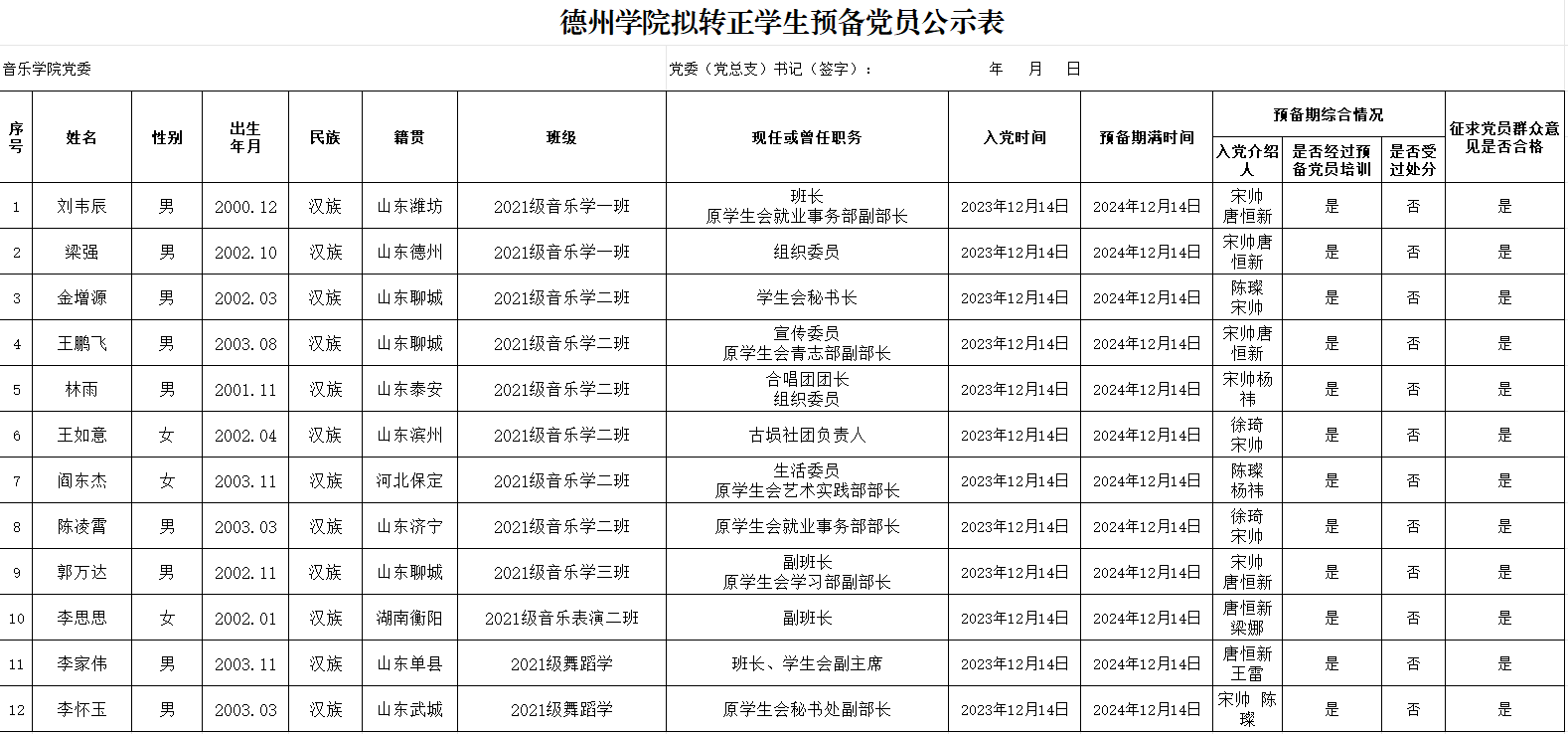 经党组织培养考察,征求党员、群众和入党介绍人意见,拟于近期讨论刘韦辰等13名同志转为中共正式党员。为增强发展党员工作的透明度,接受党内外群众的监督,确保发展党员的质量,根据上级文件精神和《中共伟德国际1946委员会发展党员工作实施细则》的要求,现将拟讨论转正的中共预备党员基本情况公示如下(名单附后):