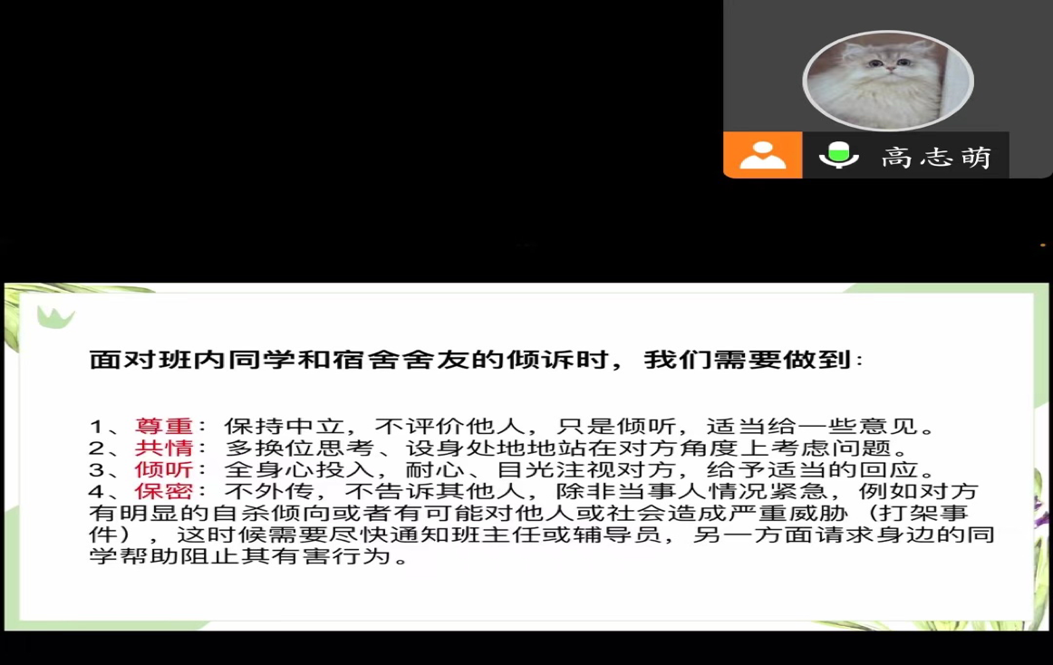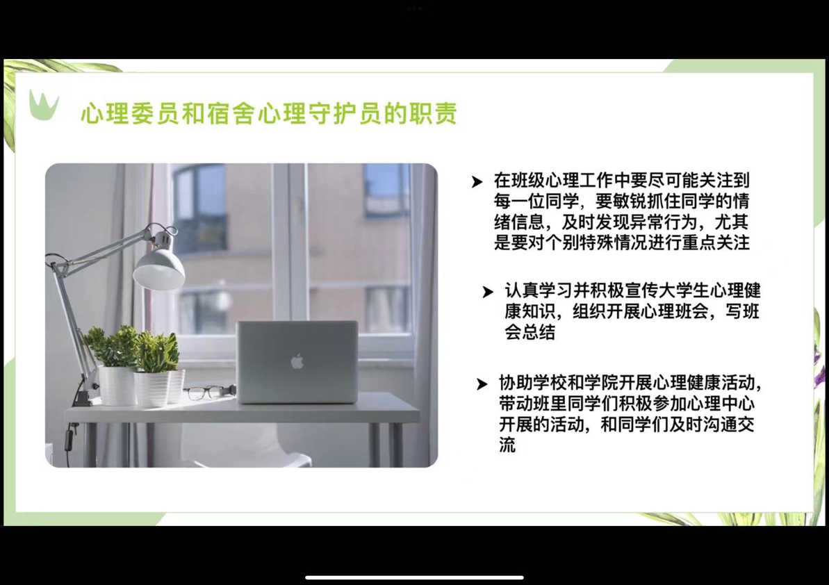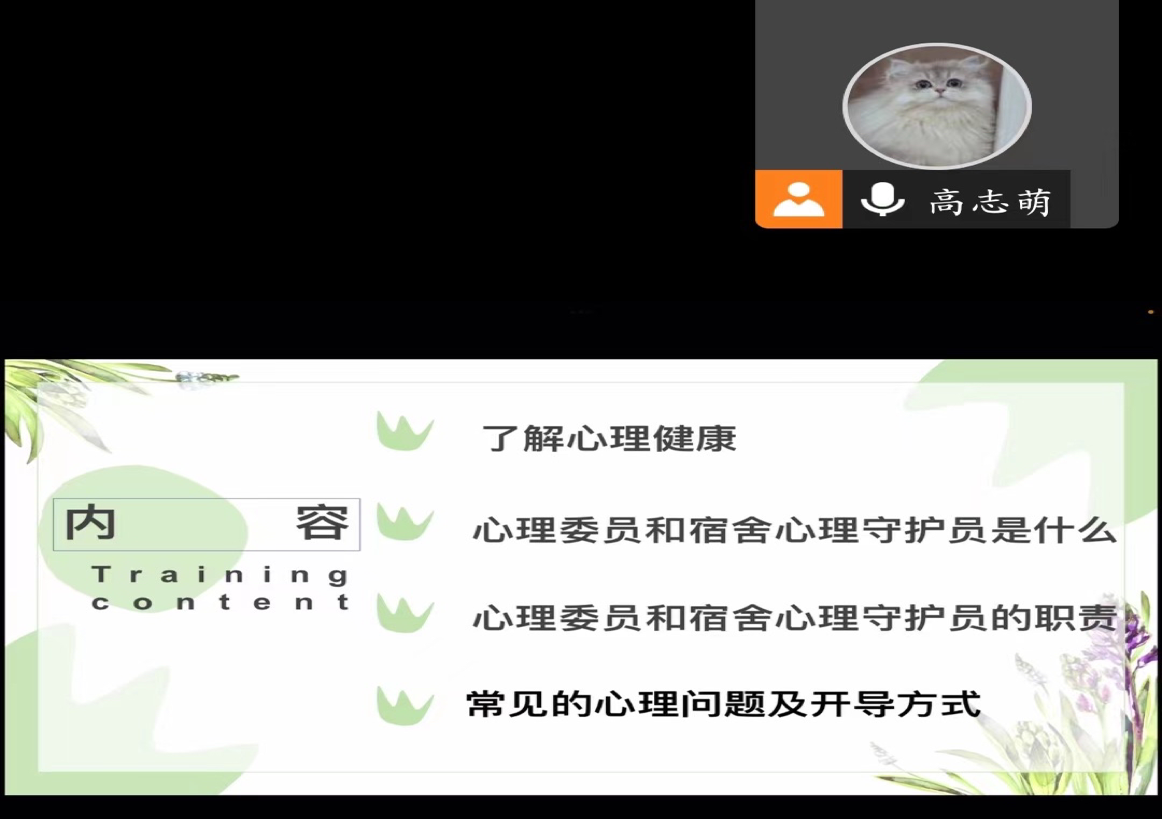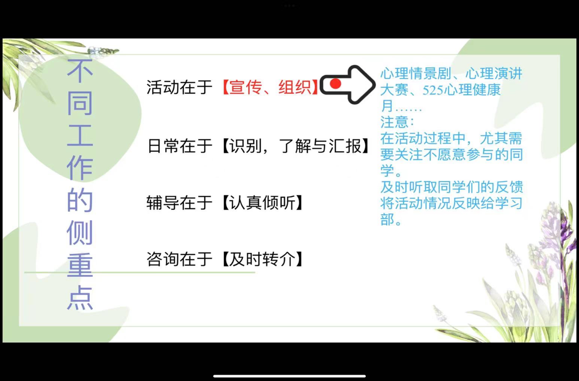 会议中,主持人向大家讲解心理健康对于大学生的重要性,阐明心理委员和宿舍心理守护员在高校心理健康工作中的重要性,并鼓励心理委员,宿舍心理守护员在接下来的培训中积极参加,共同守护好伟德国际victor1946学生群体心理健康工作。