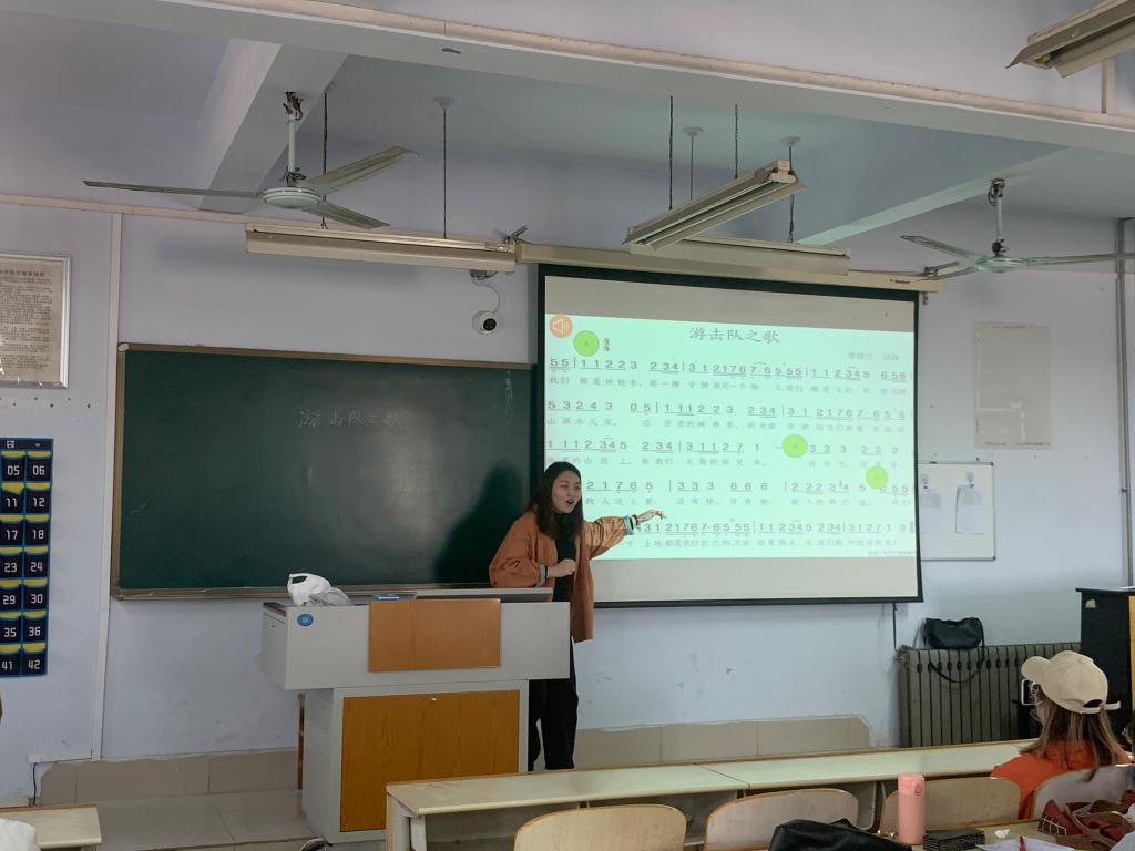 接下来由卢晓彤同学为大家展示了人音版九年级教学内容——《游击队之歌》,她的讲课轻松活泼,师生互动愉悦,洋溢着青春的活力与激情,对每一个知识点、节奏型的讲解清晰,教学手法多样,专业基本功扎实,取得了很好的教学效果。最后,18级同学和教学展示同学针对初次体验讲课遇到的问题和困惑进行了交流。