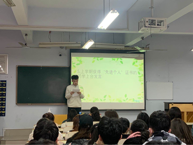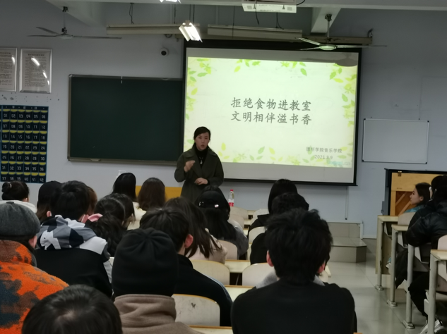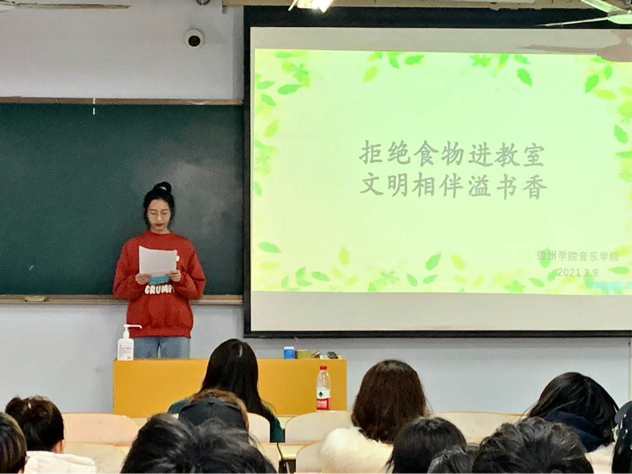 活动开始,师生共同观看近期学院教室出现的食物垃圾照片,以及拒绝食物进教室宣传片,随后由各班代表上台发言,他们表示了要遵守活动制度,带头做好表率。最后,陈璨老师与贺昱老师向同学们强调了此次活动的重要性以及本次活动的主要目的,对本次活动进行总结,共同为营造健康生活,也为了使同学们养成不带食物进教室的良好习惯,让同学们拥有一个良好的生活、学习环境。