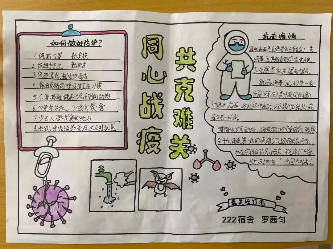疫情之下前线的医护人员、政府人员、警卫人员等都冒着生命危险抗击病毒。我们作为学生不能为国家做些什么但是我们可以做到少出门、戴口罩,做好自身防护,宣传防疫知识为疫情防控做出点贡献。近日,伟德国际victor1946部分同学制作了简笔画、手抄报、举牌照等为疫情的工作人员们加油!