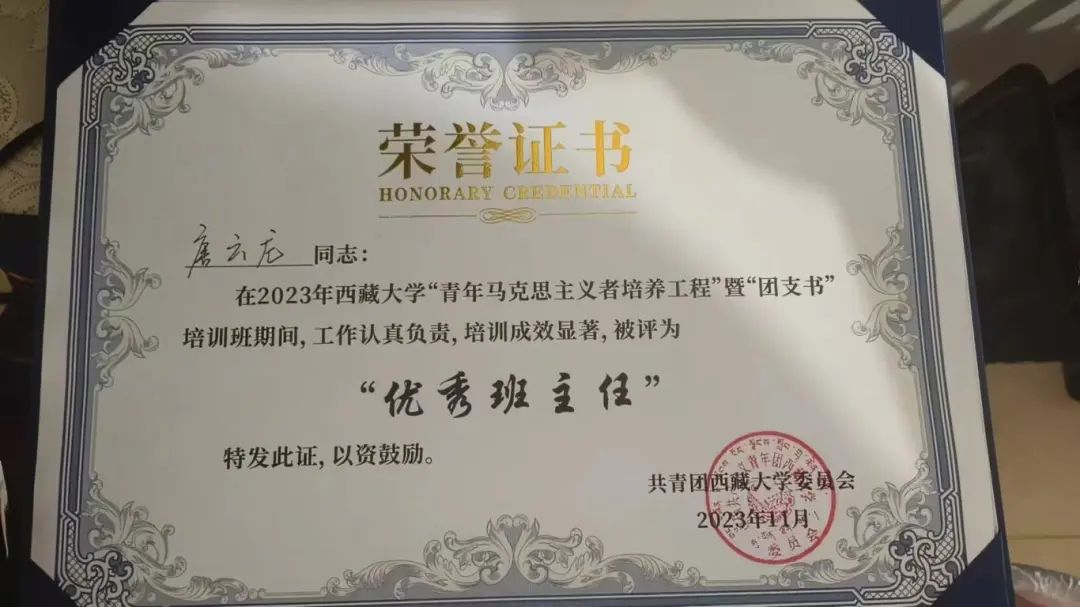 2.在2023年11月西藏大学“青年马克思主义者培养工程”暨“团支书”培训班中被评为“优秀班主任”。