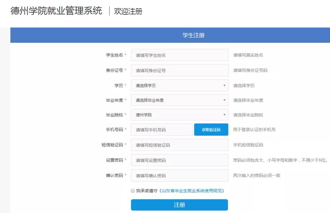 (3)填入栏目中全部准确信息,获取“短信验证码”后输入,选择“我承诺遵守”,点击“注册”按钮。