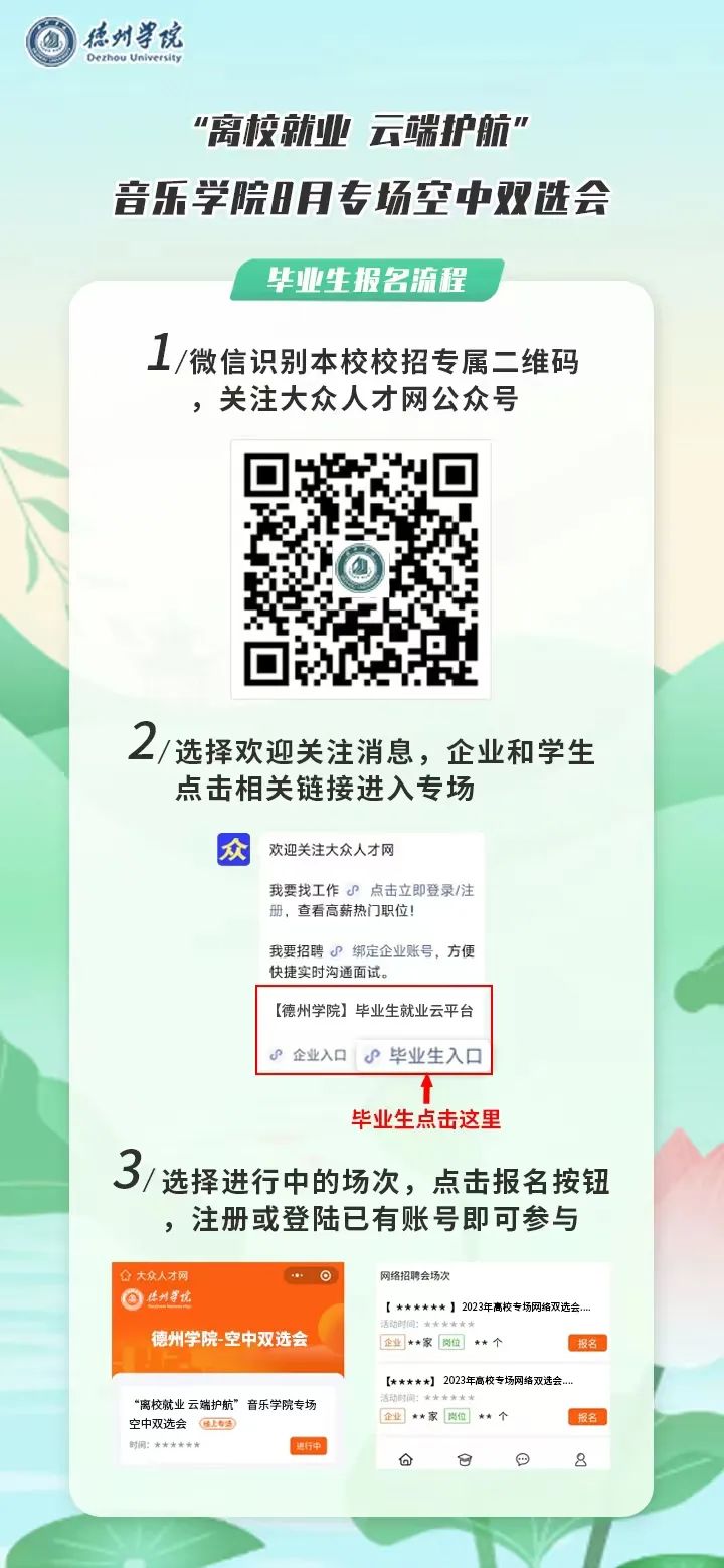 手机微信扫码关注“大众人才网”微信公众号,企业和毕业生分别点击相关按钮进入伟德国际1946校招端口,点击本学院报名按钮,注册或登录已有账号即可直接参与。