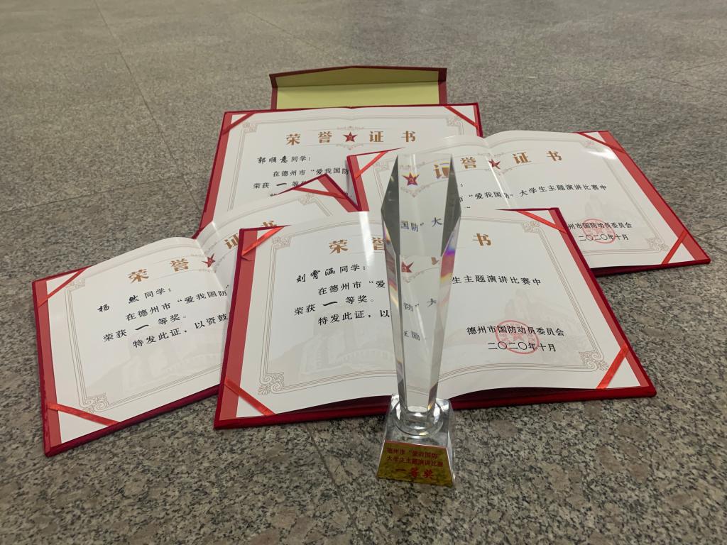 比赛结束,他们没有辜负老师和同学们的期望,荣获了德州市“爱我国防”大学生主题演讲比赛一等奖,赢得了评委老师和观众们的高度评价,并顺利进入山东省“爱我国防”演讲比赛。希望他们在接下来的比赛中再接再厉,再创佳绩!