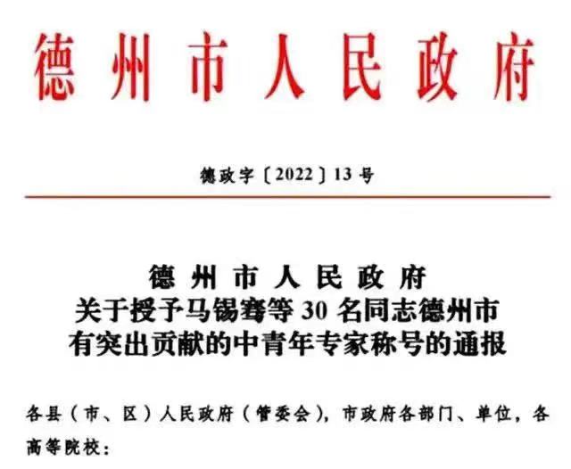喜报!伟德国际victor1946马锡骞老师入选德州市有突出贡献的中青年专家