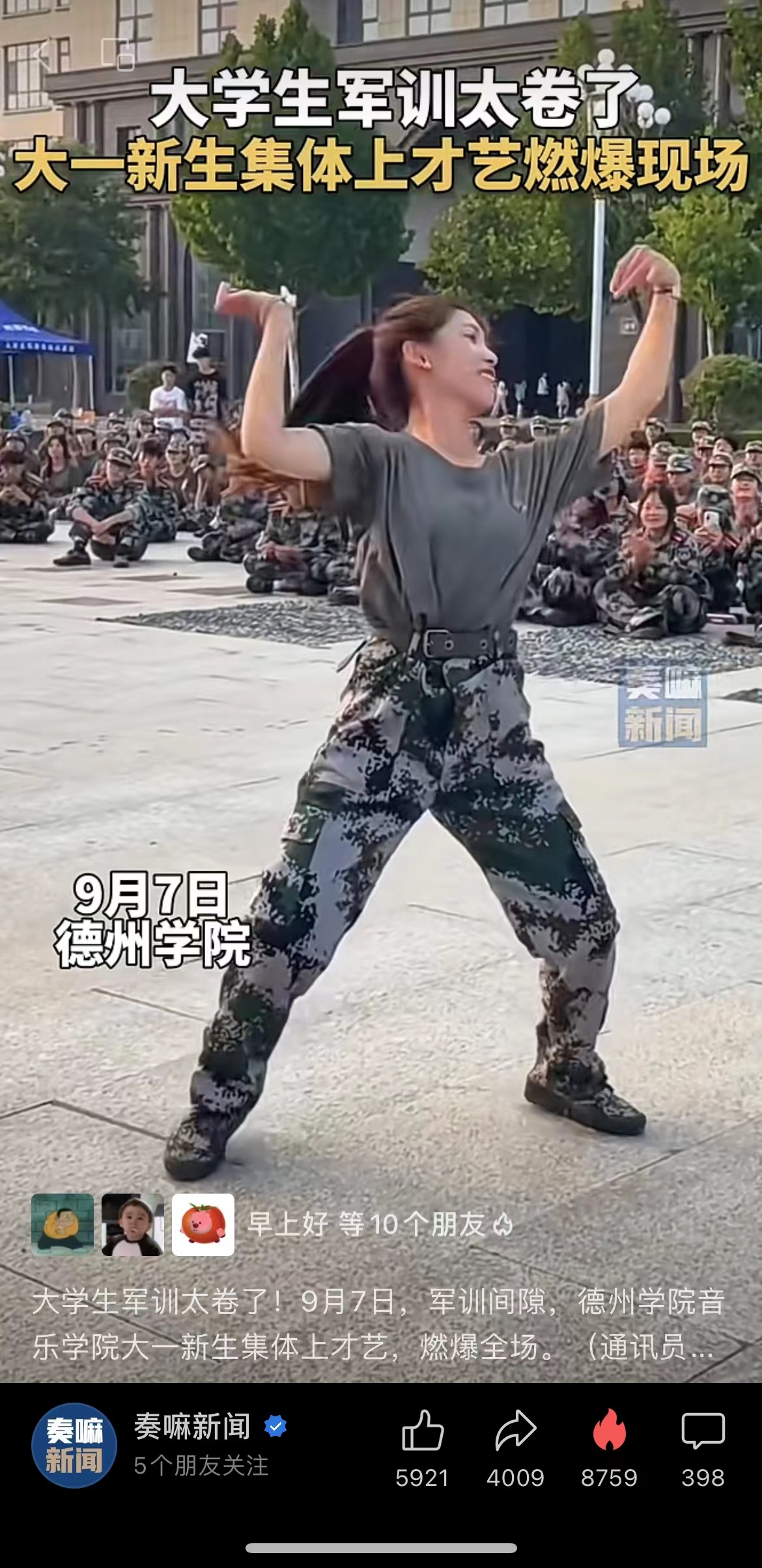 【德州广播电视台】大学生军训太卷了!9月7日,军训间隙,伟德国际victor1946大一新生集体上才艺,燃爆全场。(通讯员:朱建航)