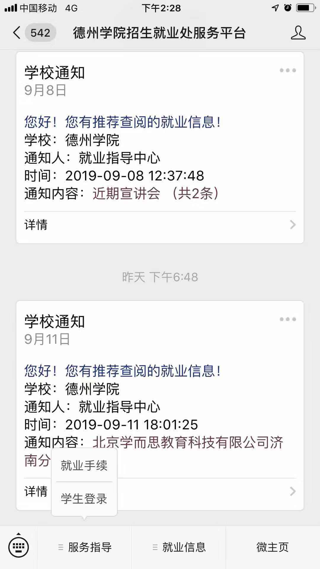 2.进入服务公众号后点击“服务指导”——“学生登录”