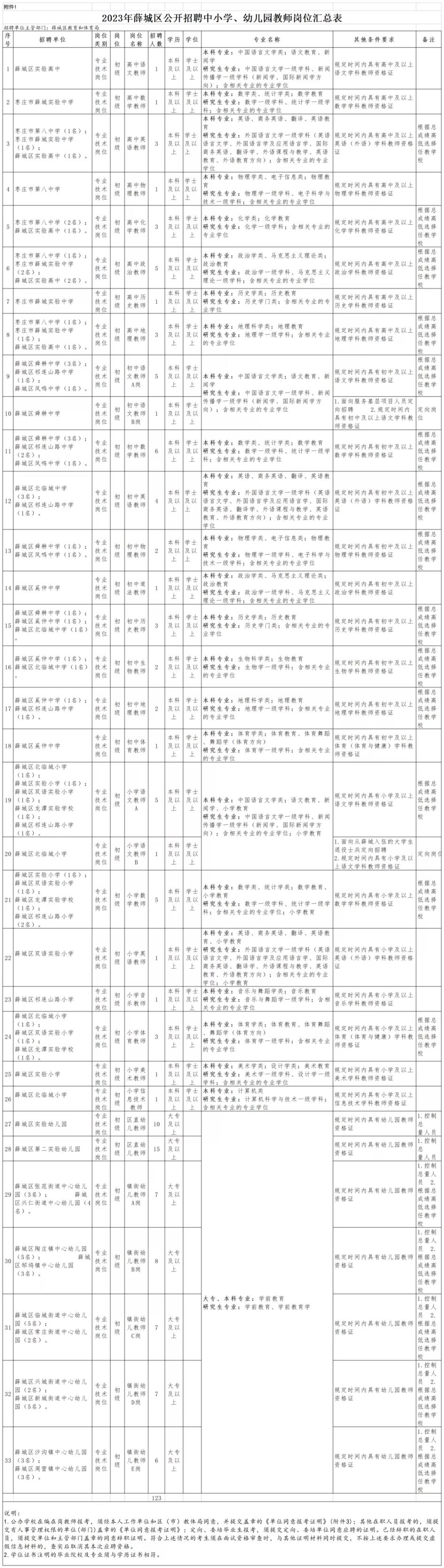 (四)招聘岗位要求的专业、学历学位、教师资格条件,详见《2023年薛城区公开招聘中小学、幼儿园教师岗位汇总表》(附件1,以下简称《岗位汇总表》);